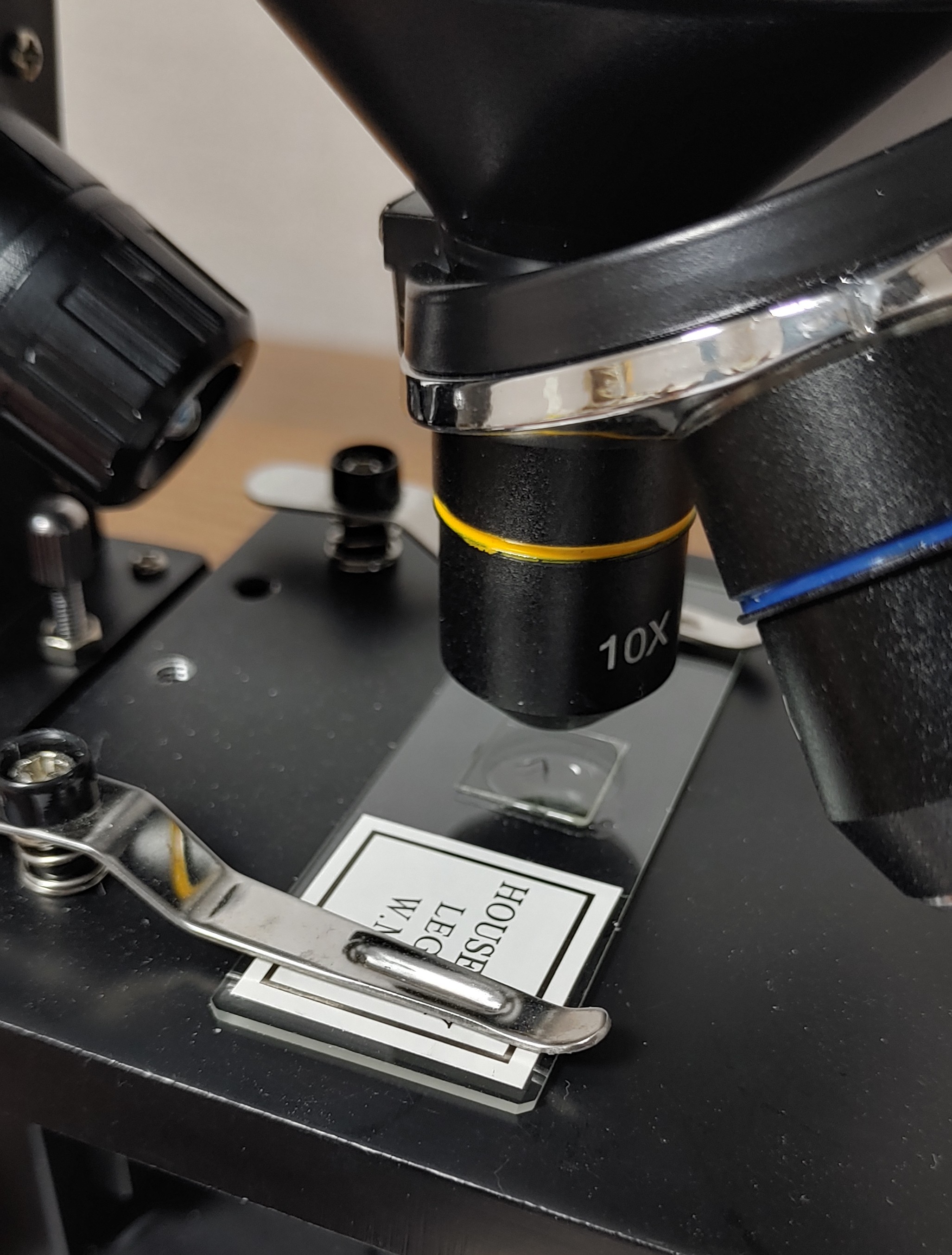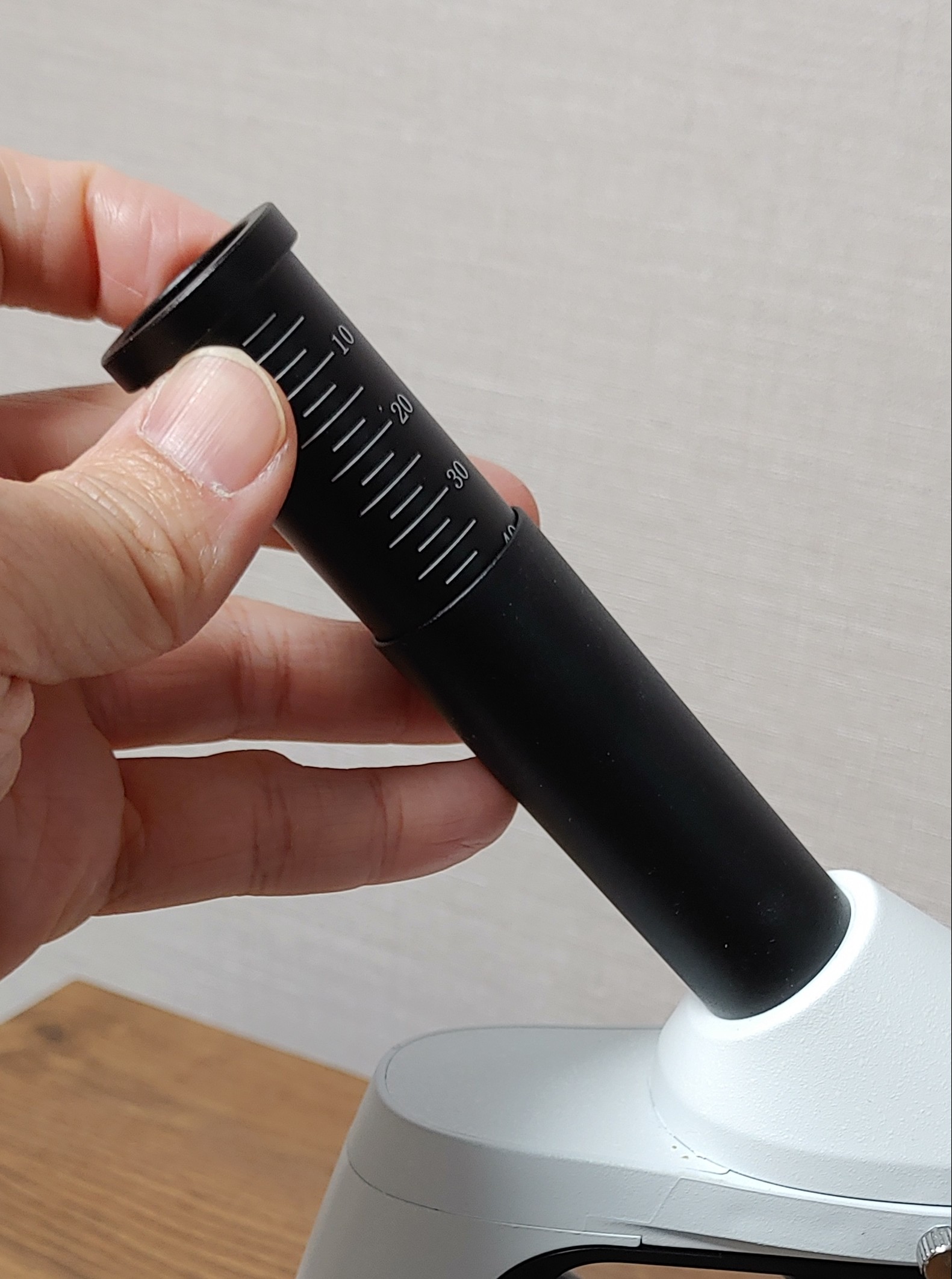 대물렌즈 10배율에 셋팅하고 하측광원을 켠 상태에서 조정링을 돌려 포커스를 맞춥니다.(바로우렌즈 2배 x 접안렌즈 10배 x 대물렌즈 10배 = 200배율)