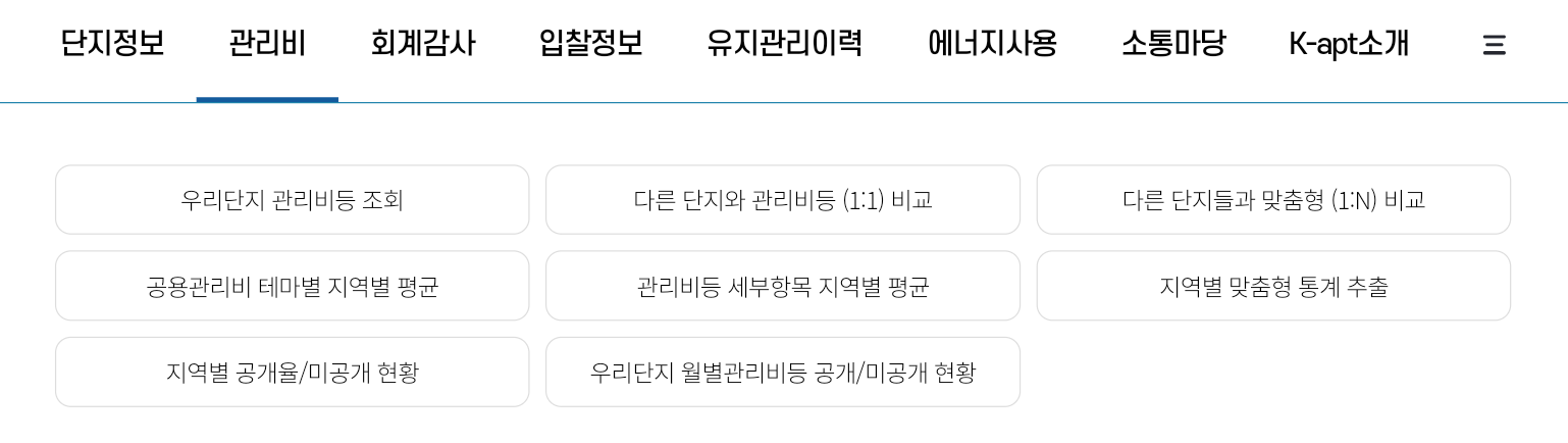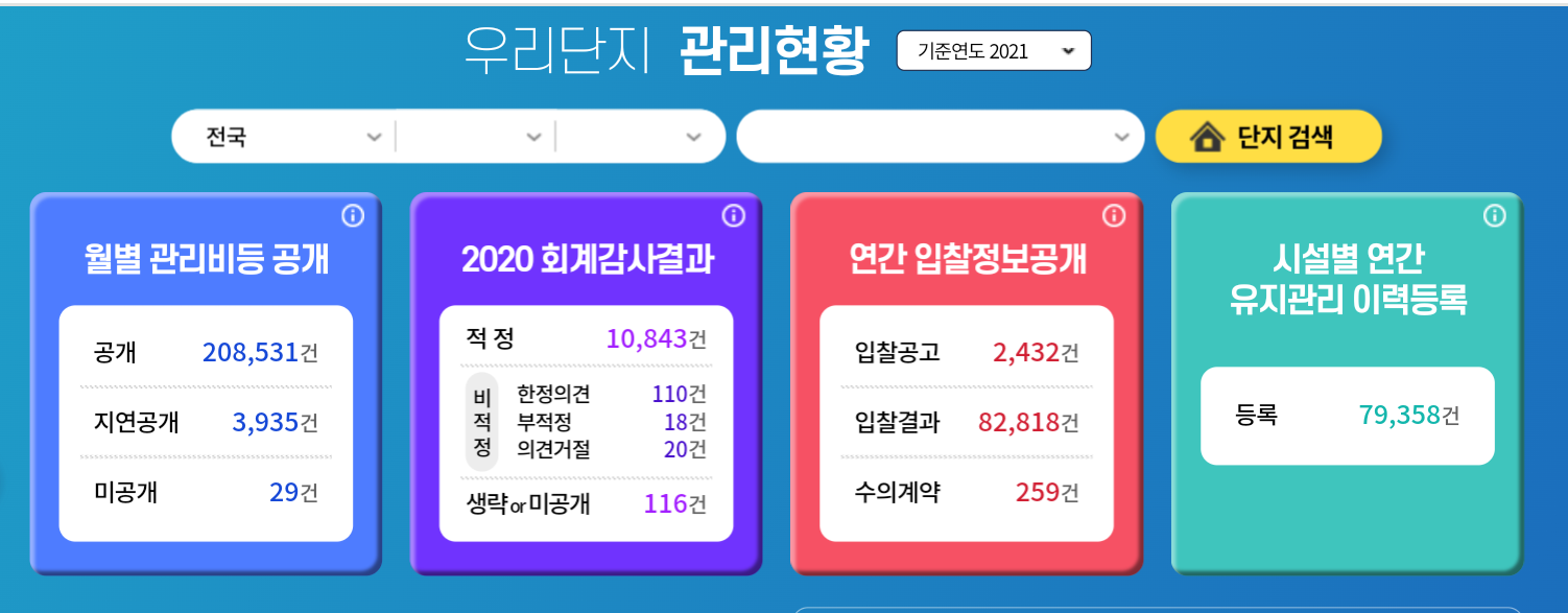 각 아파트에서는 의무적으로 국토교통부 등에 관리비 및 회계감사결과 등을 신고해야 하며 국토교통부 등에서는 공동주택 관리비의 투명화와 건전한 관리문화를 위해 이 사이트를 통해 공개하고 있습니다.