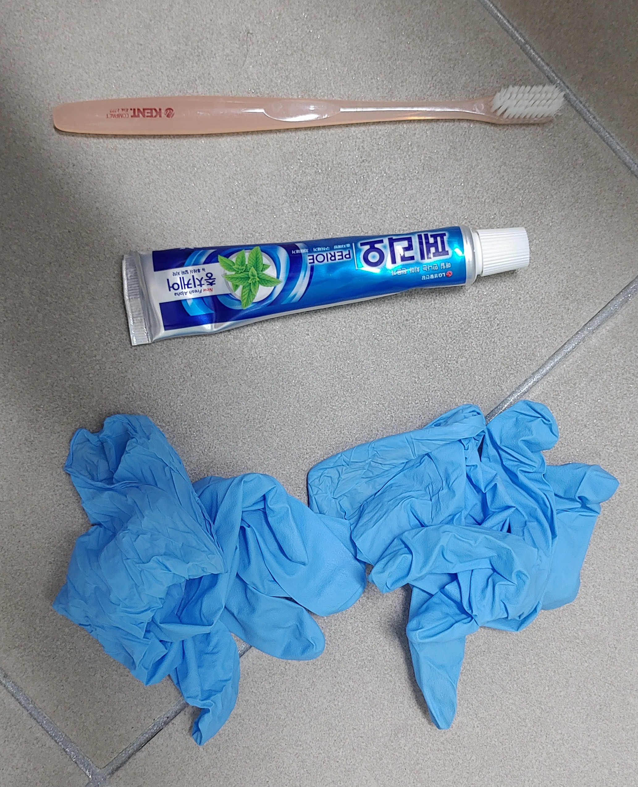 먼저 라텍스 장갑, 사용이 힘든 솔이 벌어진 칫솔과 유통기한 지난 치약을 준비해줍니다.